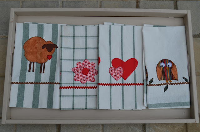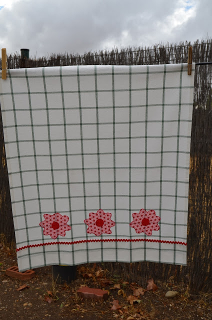Cuatro paños de cocina, de lo más sencillos que puedes encontrar en una tienda que tiene tres vocales y una consonante, unos dibujos guardados que pueden servir para que los niños o niñas coloreen, o para aplicar en los paños de cocina, un poquito de tiempo y cose que te cose hasta que los acabas.